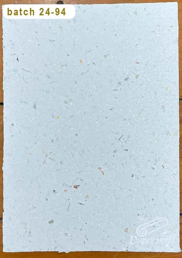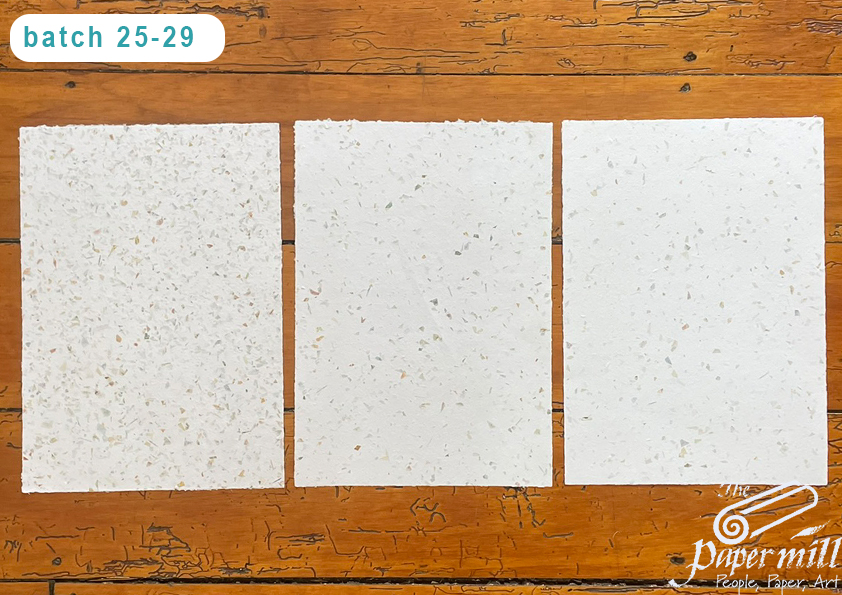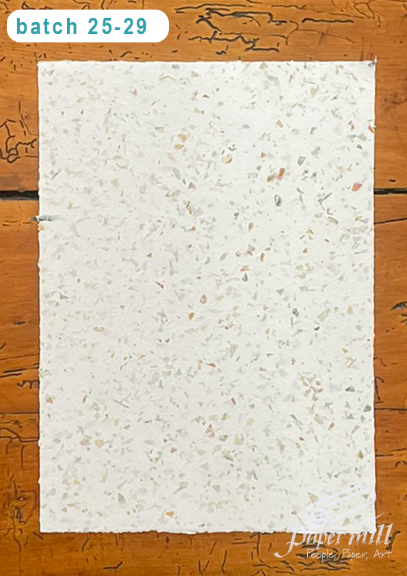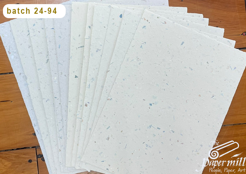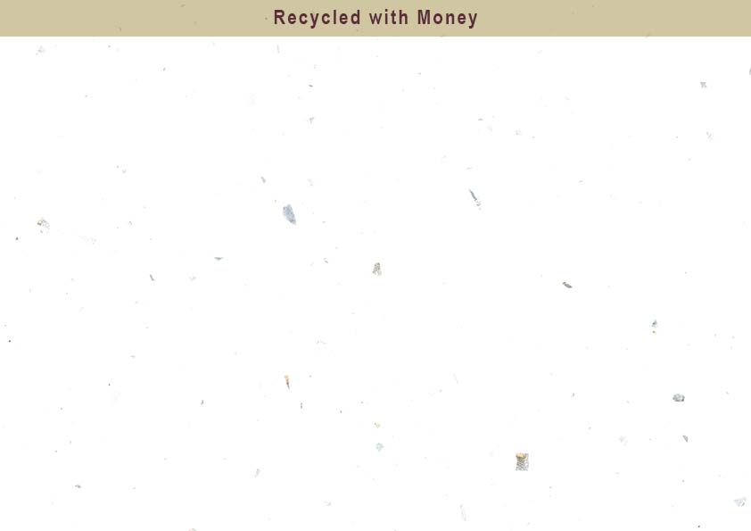 When the money factory closed in Whangarei in 1990 we received bags of tiny pieces of decommissioned NZ currency notes. We mix these minute pieces in the baths with pulp resulting in one of our best selling papers!