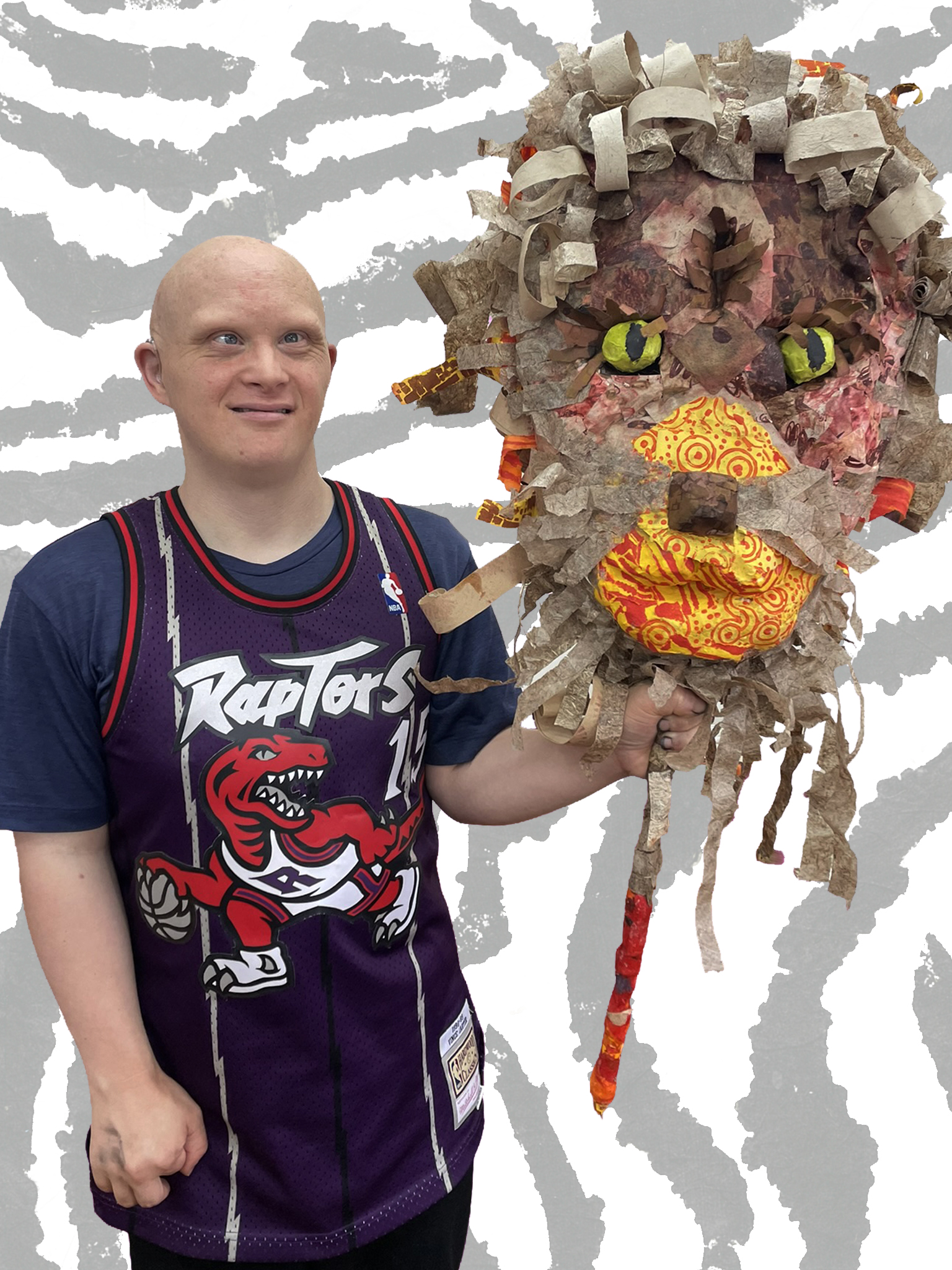 Method: I made a foam head and covered it with handmade paper and felt pen dots. I used PVA on the strips to make them strong. I made a nose out of paper layers and printed, stamped and drew on lots of paper to cover the head for Mufasa’s mane. I am proud of my lion king!”