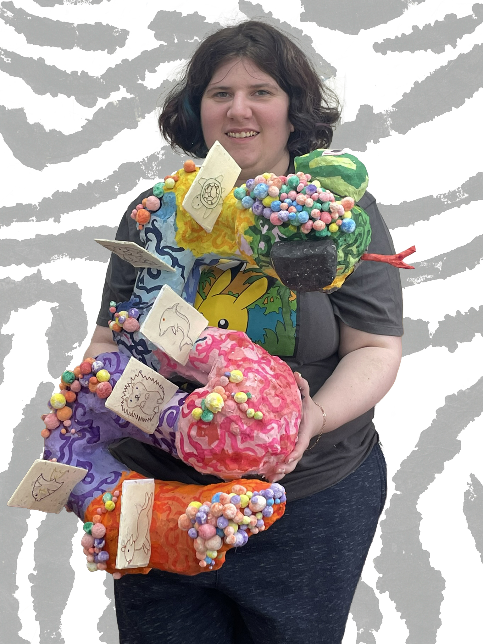 Method: I made a foam base that got bigger and fatter than I planned. I covered it in coloured paper, drew the patterns with sharpies and mad ethe eyes and tongue out of paper mache. I drew and sewed animal cards to go along his back becaue I really loe all animals and wanted to show that.