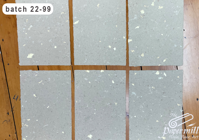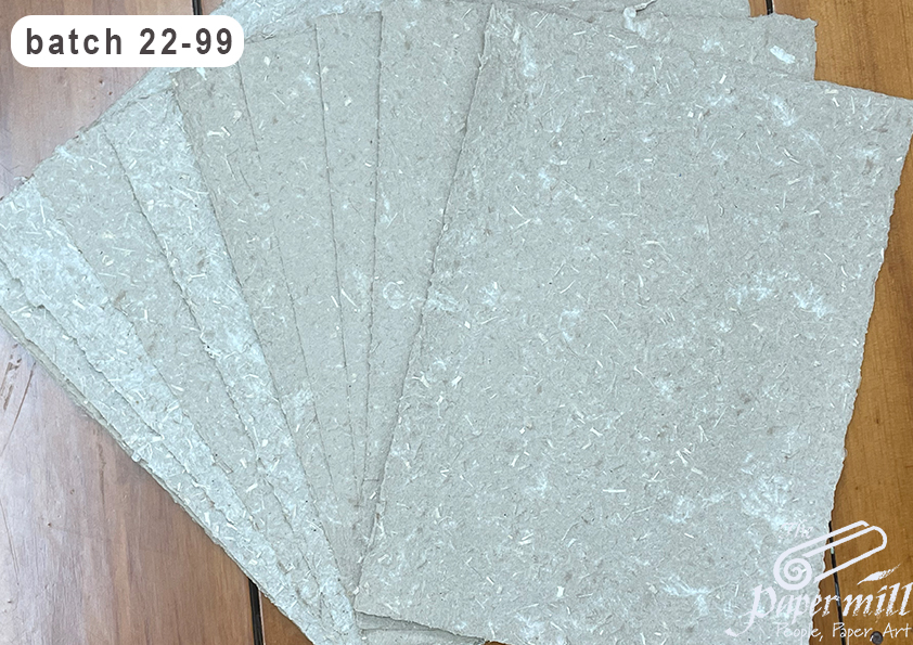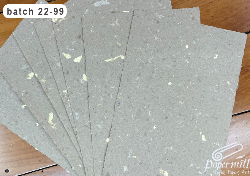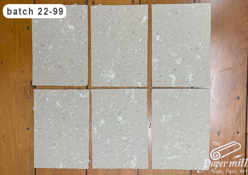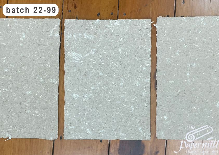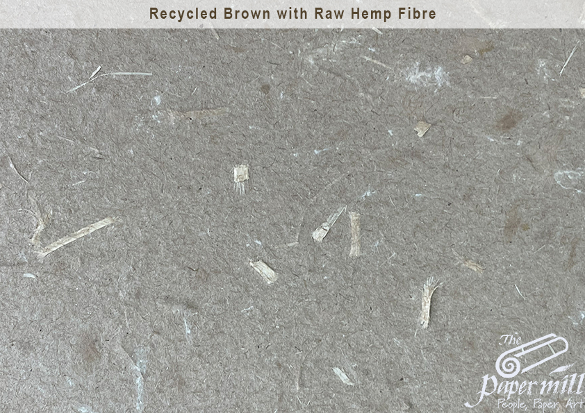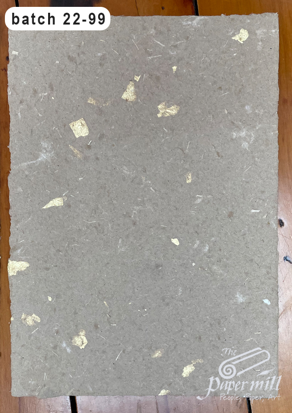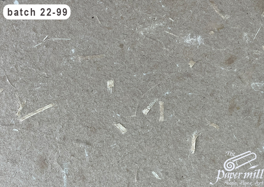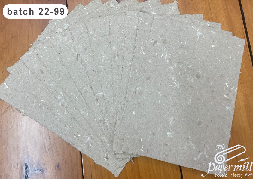 There was a small batch of 100% raw hemp fibre in July 2022. There wasn’t enough fibre left to continue making pure raw hemp paper so a brown paper bag pulp was added. The result is a textured brown paper in various shades especially in the A4 size. This paper was made by Angela, Casey, Janelle, Jennifer, Michelle & Vanessa.