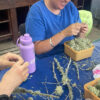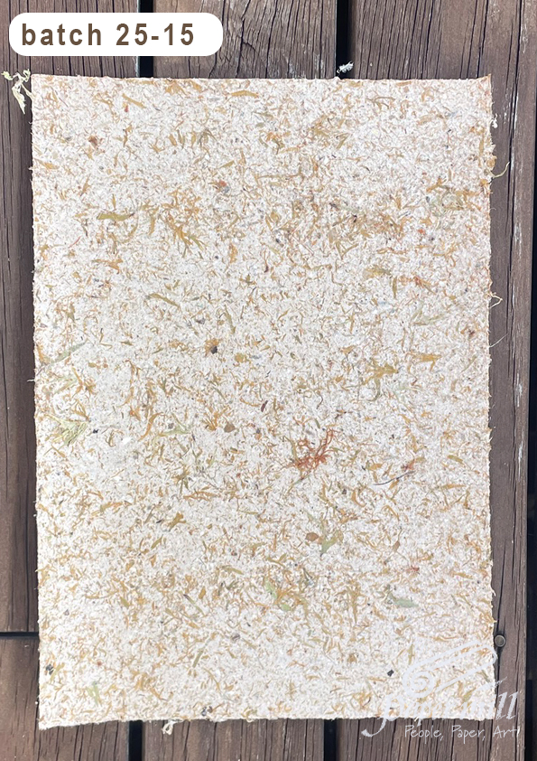 No the title is not incorrect.  We tried making paper out of pure lichen but as we suspected there wasn’t enough cellulose to hold it together so we mixed in 6 A4 sheets of recycled w. wild ginger to hold it together. Loving the texture and patterns. The Lichen was plucked from twigs boiled for a couple of courses, rinsed and put in the hollander for 2 hours where it turned orange and foamed!