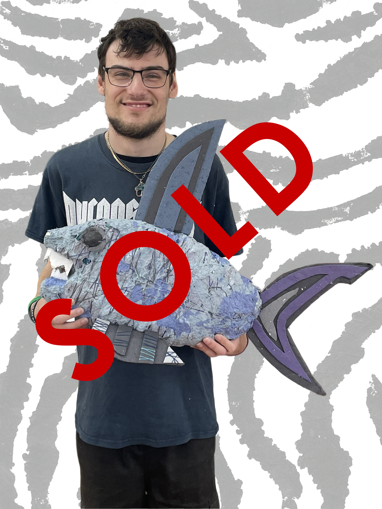 Method: My shark is made of foam wrapped in wool and dipped in paper soup. I made the tall teeth, eyes and fins out of paper and glue.