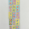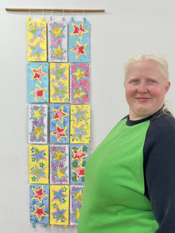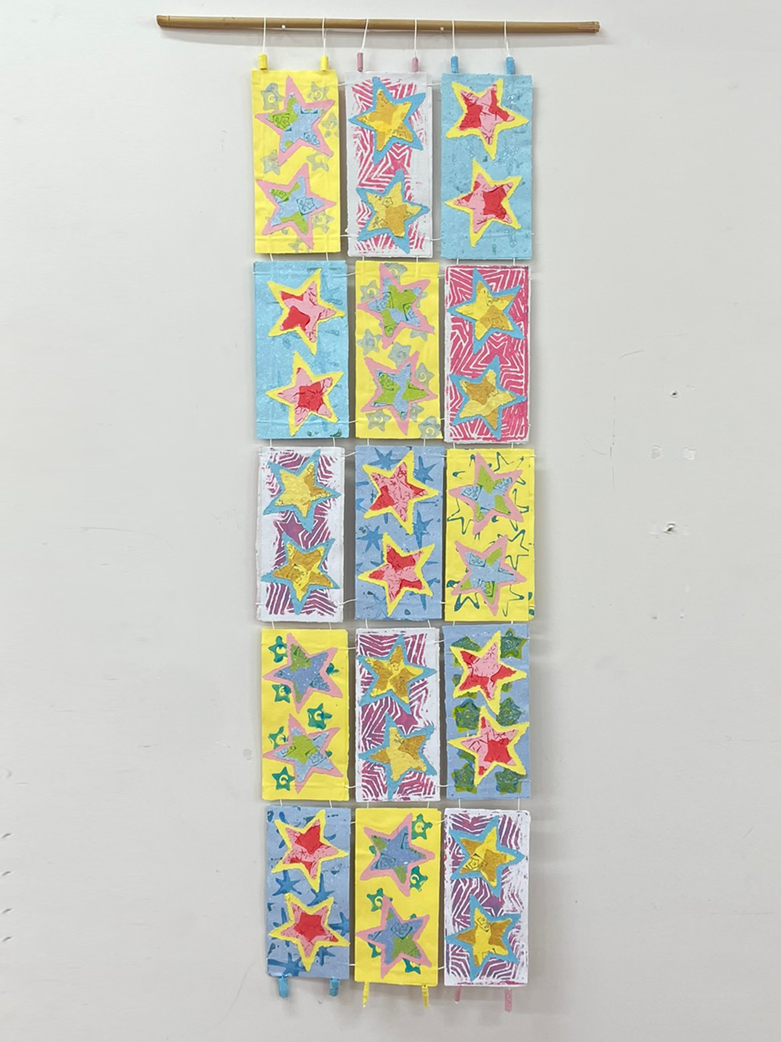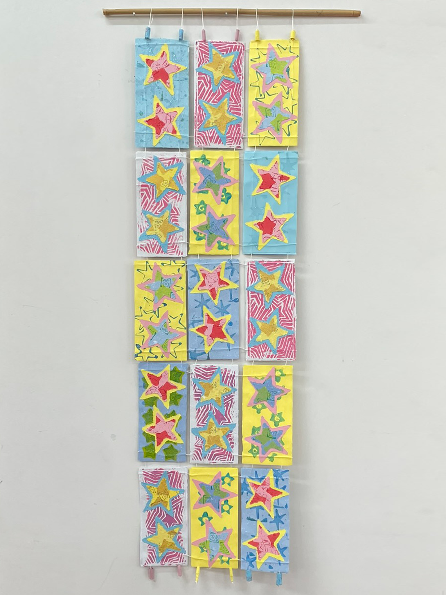 The story behind the artwork: I love looking at the pretty stars at night. I believe you can make a wish on a shooting star. This is why I chose stars for my exhibition artwork. I used an engraving pen to engrave into soft wood to create a print for some stars. I used stamps and stencils for my print with different pains. I added a little glitter which sparkles like the stars. I hope you like my artwork. I had a vision for the colours I wanted to use and used them to contrast against each other for each panel. I used stamps and soft wood that I made with an engraving pen. I used different types of inks, glitter glue, and paints for each star layer. I glued them together and hung them using paper string on a stick. I made paper beads to decorate the top and bottom of my curtain.