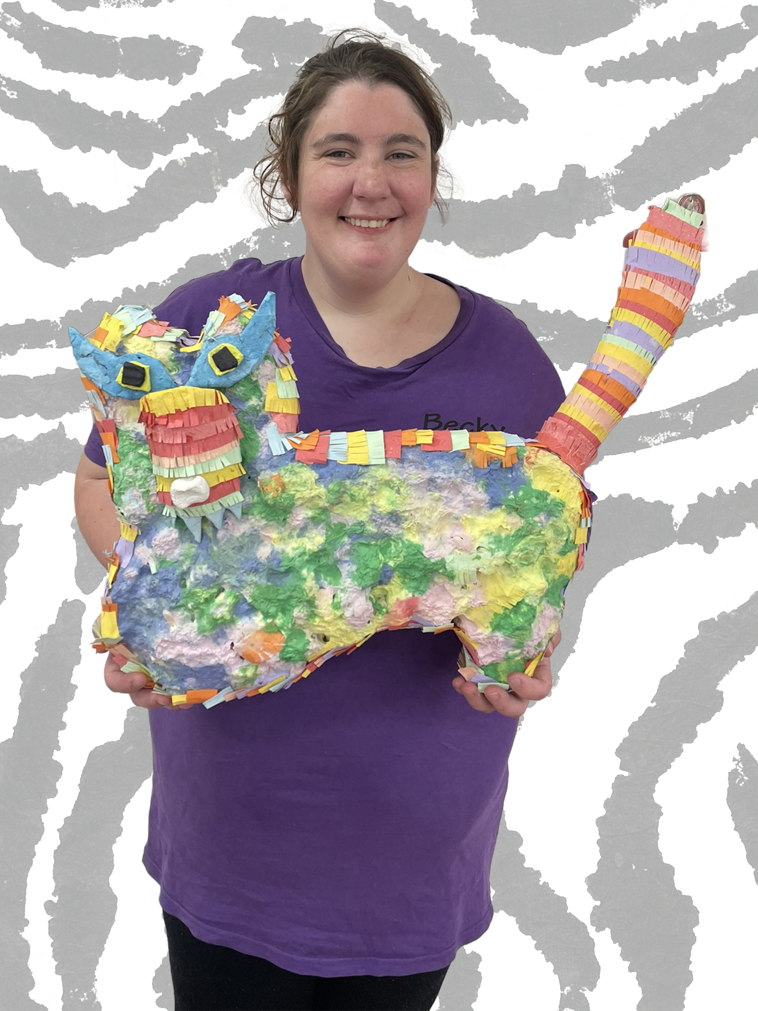 Method: I made my piece with paper pulp, foam, cardboard and strips of paper that were hot glued. I used solf pulp and toilet paper rolls and a bead. I was inspired because I like werewolves and rainbows.